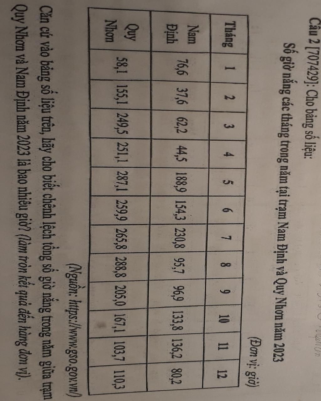 Chênh lệch tổng số giờ nắng trong năm giữa trạm Quy Nhơn và Nam Định là: