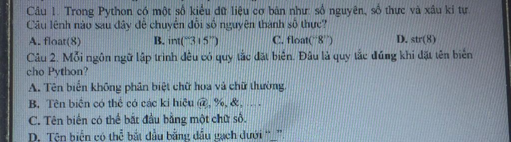 `*`C. float("8") là không hợp lệ, vì float chỉ có thể chuyển đổi một xâu biểu thị số thực thành kiểu float.