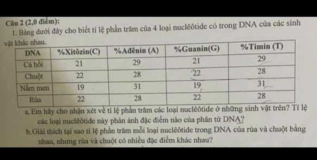 1. a) Nhận xét về tỉ lệ phần trăm của các loại nuleotide ở những sinh vật trên là: