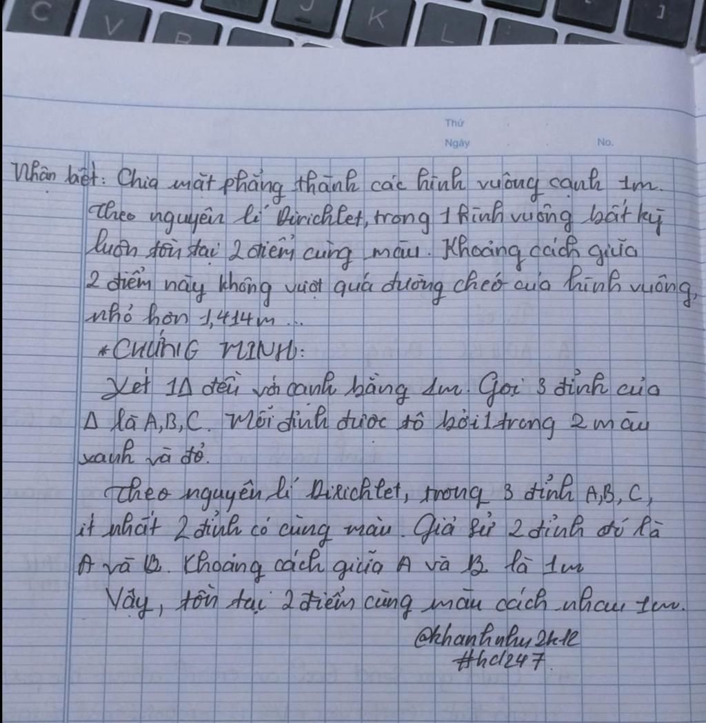 Trên mặt phẳng, mỗi điểm được tô bởi 1 trong 2 màu xanh hoặc đỏ. Cmr tồn tại 2 điểm cùng màu cách nhau 1m