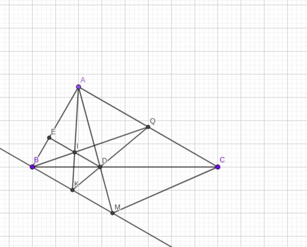 b, Kẻ DE vuông góc với AB tại E, gọi I là trung điểm DE, đường thẳng qua B song song với AC cắt AI tại K, cắt AD tại M, chứng minh BK/EI = KM/ID và K là trung điểm BM