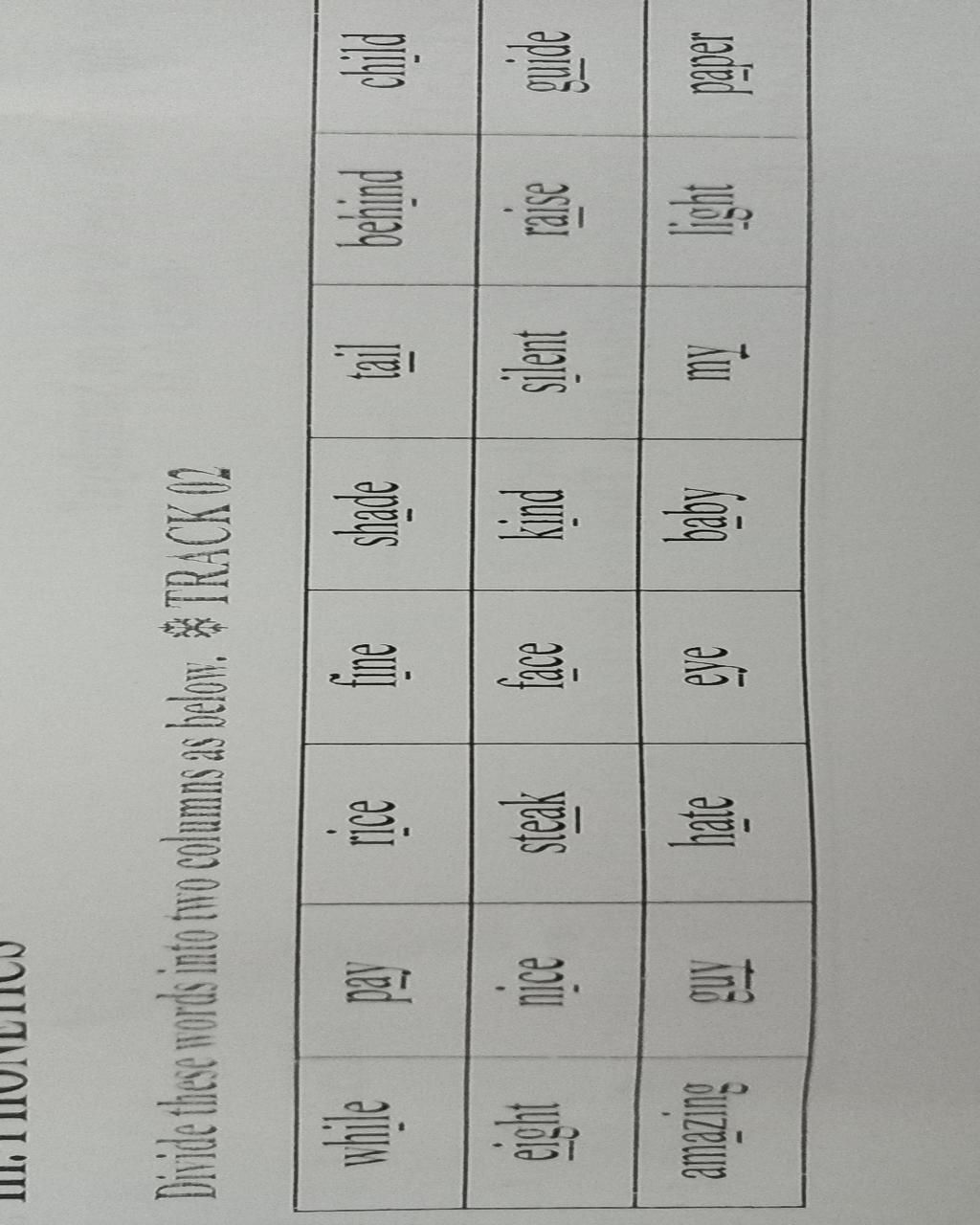 / aɪ / : While , rice , fine , behind , child , nice , kind , silent , guide , guy , eye , my , light , sigh , island , buy