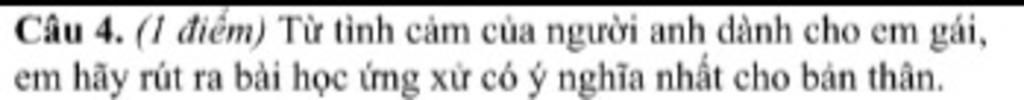 tình cảm dành cho em gái là ; phải biết quan tâm, chăm sóc cho em , nếu em bị bắt nặt hay bị ứng sử xấu thì anh phải đứng lên bảo vệ cho em gái ( đứng trc công lí và lẽ phải )