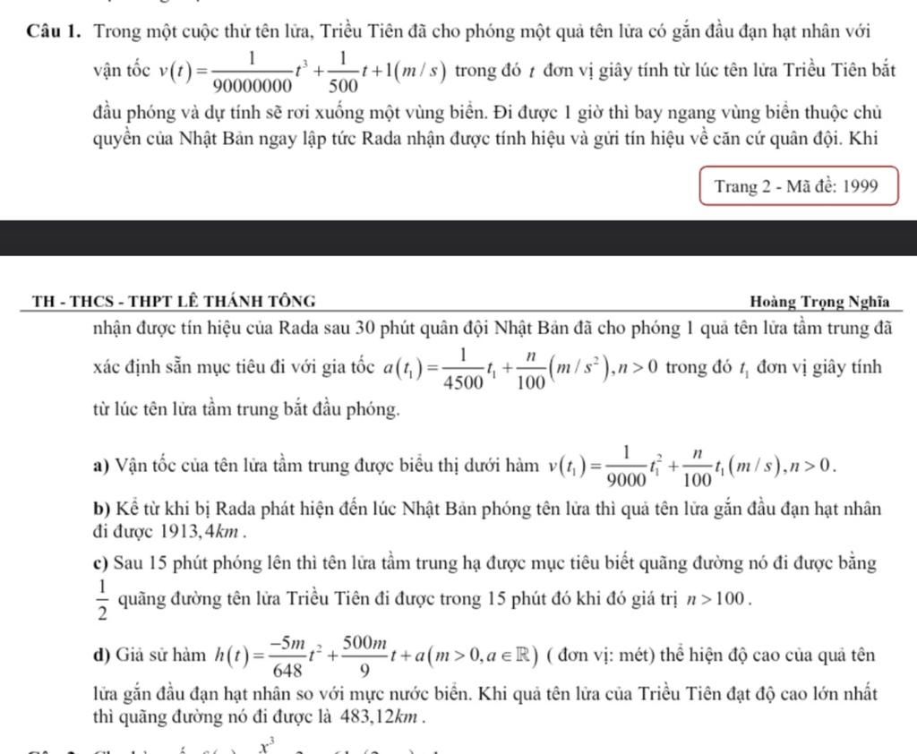 Câu 1. Trong một cuộc thử tên lửa, Triều Tiên đã cho phóng một quả tên lửa có gắn đầu đạn hạt nhân với