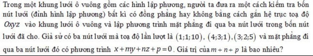 `A(1;1;10)`, `B(4;3;1)` và `C(3;2;5)`