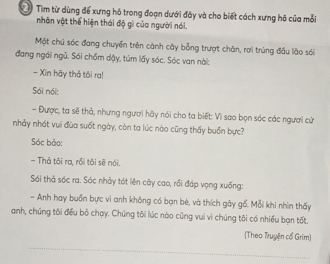 +Ta và ngươi: Cách xưng hô này thể hiện sự ngạo mạn và coi thường của Sói đối với Sóc. Sói tự coi mình là kẻ mạnh, có quyền lực và không coi sóc là ngang hàng.