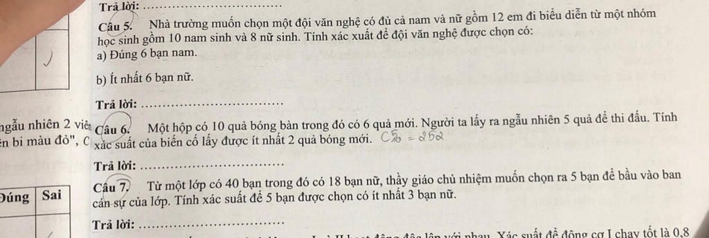 ⇒ Xác suất trong 12 em có đúng 6 em nam : $P (A) = \dfrac{n(A)}{n (\Omega)} = \dfrac{C_10^6 . C_8^6 }{C_18^12} = \dfrac{70}{221}$