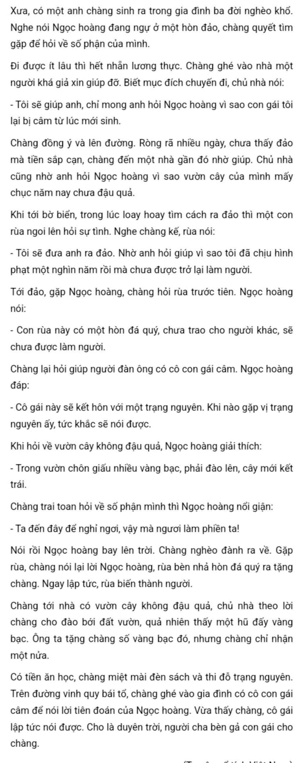 `-` Câu chuyện nhấn mạnh bài học về lòng nhân hậu, sự sẻ chia, và sự nỗ lực vượt qua nghịch cảnh. Chàng trai nghèo, dù gặp khó khăn, luôn sẵn lòng giúp đỡ người khác, nhờ đó nhận được sự đền đáp và cơ hội đổi đời. Đồng thời, câu chuyện khuyến khích ta hành động đúng đắn, trân trọng cơ hội, và tin rằng những việc làm tốt đẹp cùng sự kiên trì sẽ mang lại hạnh phúc và thành công.