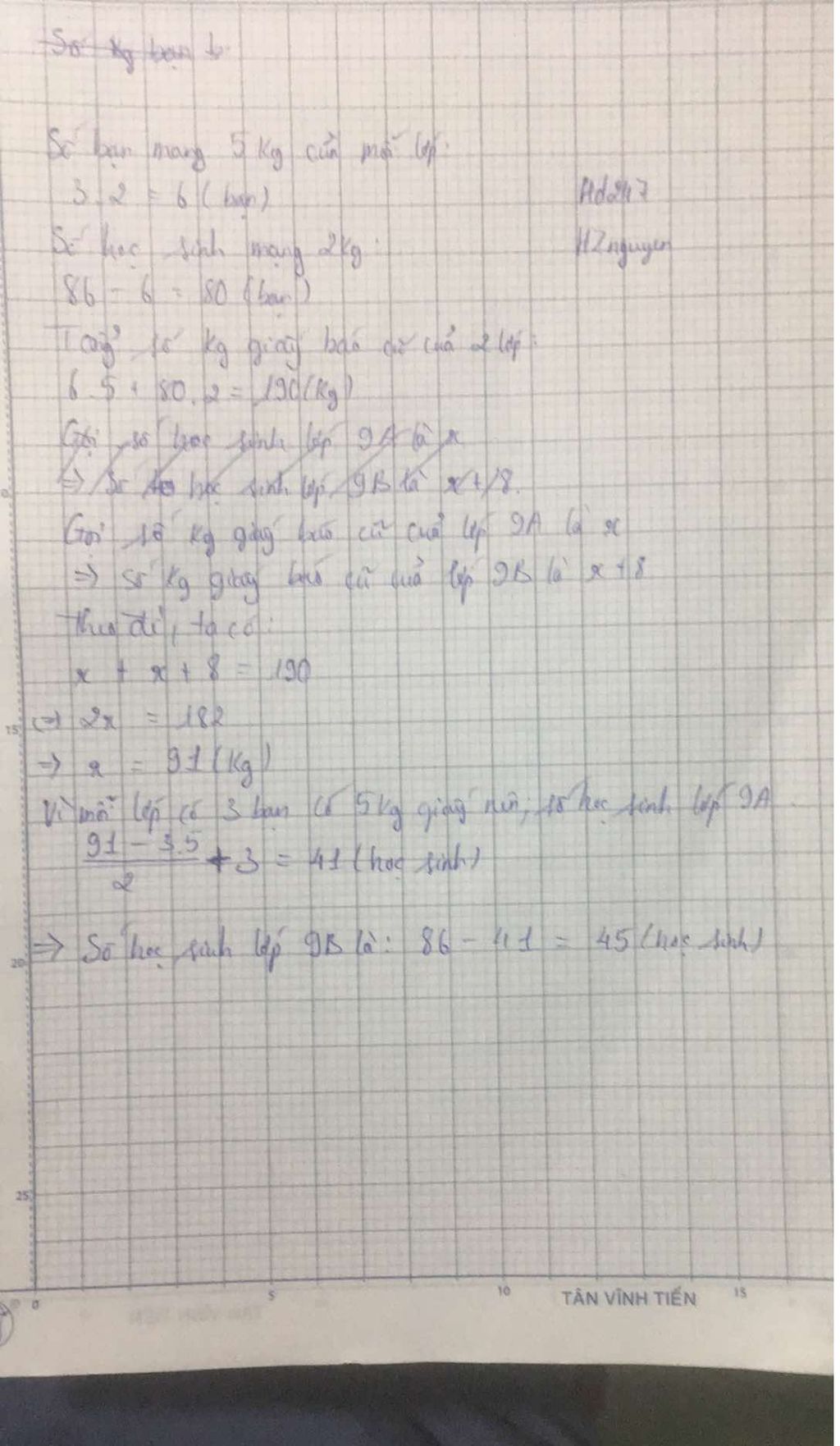 Lớp 9A và lớp 9B có tổng cộng 86 học sinh trong đợt thu hoạch giấy báo cũ thực hiện kế hoạch nhỏ mỗi lớp có 3 bạn có 5 kg các bạn còn lại mỗi lớp đóng 2 kg tính số học sinh của mỗi lớp biết lớp 90 góp nhiều hơn lớp 9A là 8 kg gì cũ
