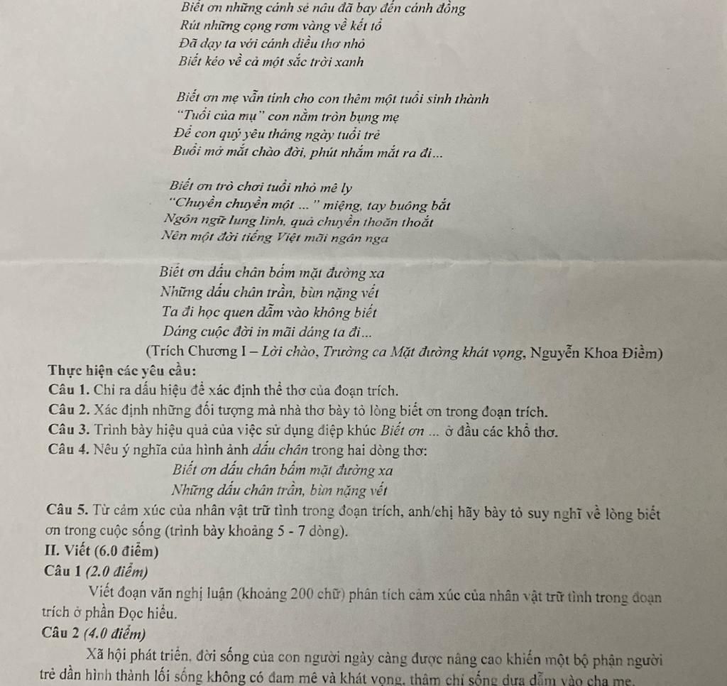 Nhân vật trữ tình biết ơn “những cánh sẻ nâu” cùng những cọng rơm vàng, cánh diều biếc đem lại cả bầu trời tuổi thơ ngọt ngào, bình yên; biết ơn mẹ đã mang nặng cho con “tuổi mụ” trong bụng, đem con đến với cõi đời, nuôi dưỡng con khôn lớn để biết khát vọng và quý trọng tuổi trẻ, quý trọng cuộc đời từ lúc sinh ra đến lúc tạ thế; biết ơn “trò chơi” bắt chuyền tuổi thơ thú vị, “mê li” với ngôn ngữ tiếng Việt đẹp đẽ và phong phú; biết ơn những “dấu chân” dẫn đường của thế hệ cha ông đi trước đầy vất vả để tìm đường cho thế hệ đi sau. Tình cảm, cảm xúc đó được thể hiện một cách chân thành và sâu sắc qua điệp từ “biết ơn” được nhấn đi nhấn lại ở đầu mỗi khổ thơ; qua hệ thống hình ảnh, từ ngữ chân thực, sinh động mà gợi cảm, có tính biểu tượng sâu sắc (cánh sẻ nâu, cọng rơm vàng, ngôn ngữ lung linh, dấu chân trần, dáng cuộc đời,...). Qua tình cảm, cảm xúc đó, tác giả muốn lan toả tới người đọc thông điệp đầy ý nghĩa: hãy trân trọng, biết ơn tất cả những gì đã tạo sinh và nuôi dưỡng mỗi con người: từ gia đình cho tới quê hương, đất nước; từ sự vật thiên nhiên quanh ta cho tới tầng sâu văn hoá, nguồn cội. Mỗi cá nhân trưởng thành đều là sự hấp thụ và chuyển hoá những giá trị của cuộc sống và con người xung quanh. Sâu xa hơn, đó cũng là lời nhắn nhủ mỗi chúng ta cần phải sống đẹp, sống xứng đáng với những điều mình đã nhận được.