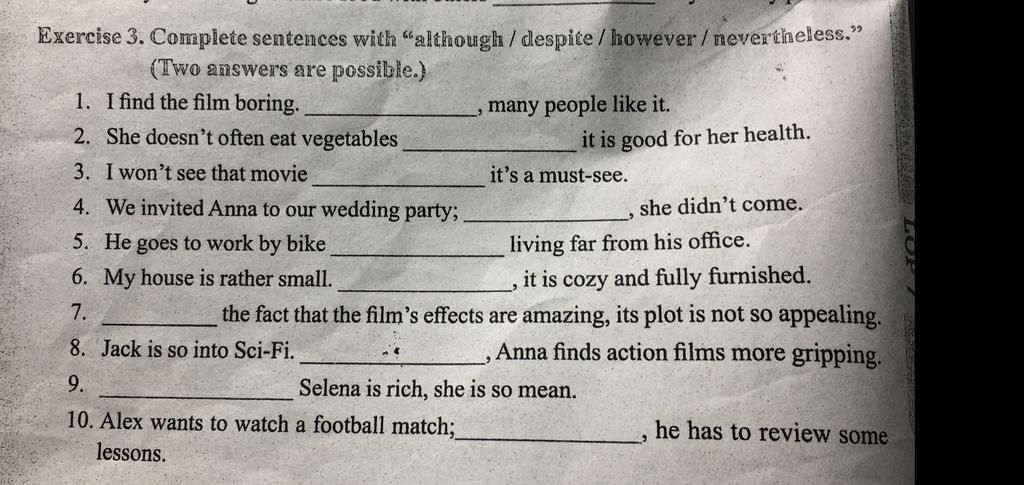`=>` despite `+` N/N phr/V-ing `+` S `+` V : dù ... `=` despite the fact that `+` S `+` V , S `+` V