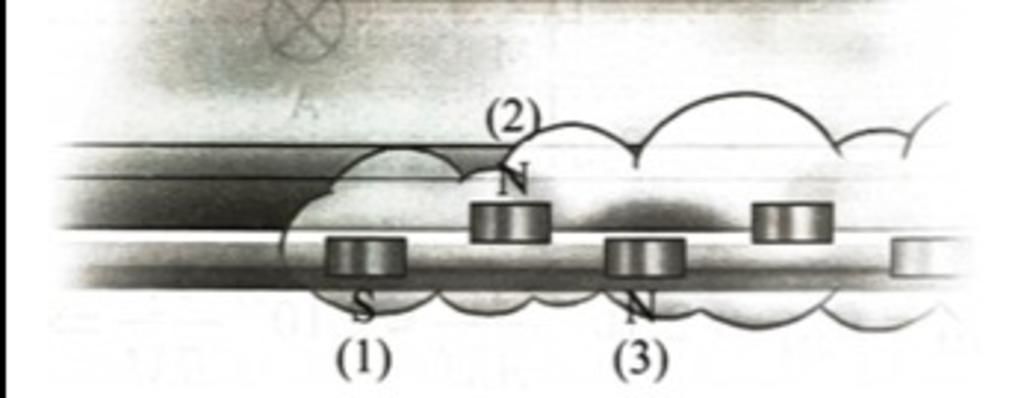 `-` Nam châm `(1)` có cực Nam (S) hướng lên trên.Nam châm `(2)` và `(3)` nằm trên đường ray có cực Bắc (N) hướng xuống dưới.