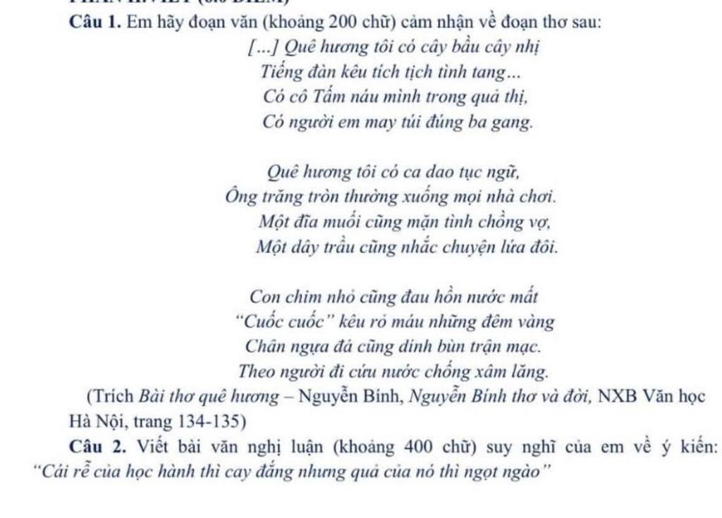 Đoạn thơ trong Bài thơ quê hương của Nguyễn Bính là một bức tranh tuyệt đẹp và đầy cảm xúc về quê hương, nơi lưu giữ những giá trị văn hóa, truyền thống và tình cảm sâu đậm của người Việt Nam. Mở đầu đoạn thơ, hình ảnh "cây bầu cây nhị" và "tiếng đàn kêu tích tịch tình tang" gợi lên vẻ đẹp dung dị, mộc mạc của cuộc sống thôn quê. Những thanh âm nhẹ nhàng ấy như một bản hòa ca bình yên, đưa người đọc trở về với miền ký ức tuổi thơ, nơi đầy ắp những kỷ niệm đẹp. Hình ảnh "cô Tấm náu mình trong quả thị" và "người em may túi đúng ba gang" không chỉ làm sống dậy những câu chuyện cổ tích thân thuộc mà còn gợi lên sự gần gũi, quen thuộc trong tâm thức người Việt. Đặc biệt, tình yêu thương, gắn bó trong đời sống gia đình và lứa đôi được khắc họa qua hình ảnh "một đĩa muối cũng mặn tình chồng vợ" và "một dây trầu cũng nhắc chuyện lứa đôi". Những câu thơ giàu tính biểu tượng này nhấn mạnh giá trị của sự thủy chung, tình nghĩa trong đời sống con người. Bên cạnh đó, tác giả cũng thể hiện nỗi đau xót trước vận mệnh đất nước qua tiếng kêu "cuốc cuốc" của "con chim nhỏ", như một lời ai oán vang vọng giữa đêm vàng, nhắc nhở những mất mát đau thương mà dân tộc phải chịu đựng. Kết thúc đoạn thơ là hình ảnh "chân ngựa đá cũng dinh bùn trận mạc", một biểu tượng cho tinh thần chiến đấu kiên cường, bất khuất của nhân dân ta trong những năm tháng kháng chiến chống giặc ngoại xâm. Nguyễn Bính không chỉ tái hiện quê hương bằng những hình ảnh thân thuộc mà còn gửi gắm trong đó tình yêu nước nồng nàn, niềm tự hào dân tộc và tinh thần lạc quan, tin tưởng vào tương lai. Đoạn thơ vì thế không chỉ đẹp về hình thức mà còn sâu sắc về ý nghĩa, làm rung động trái tim người đọc và gợi lên tình cảm yêu quê hương đất nước mãnh liệt.