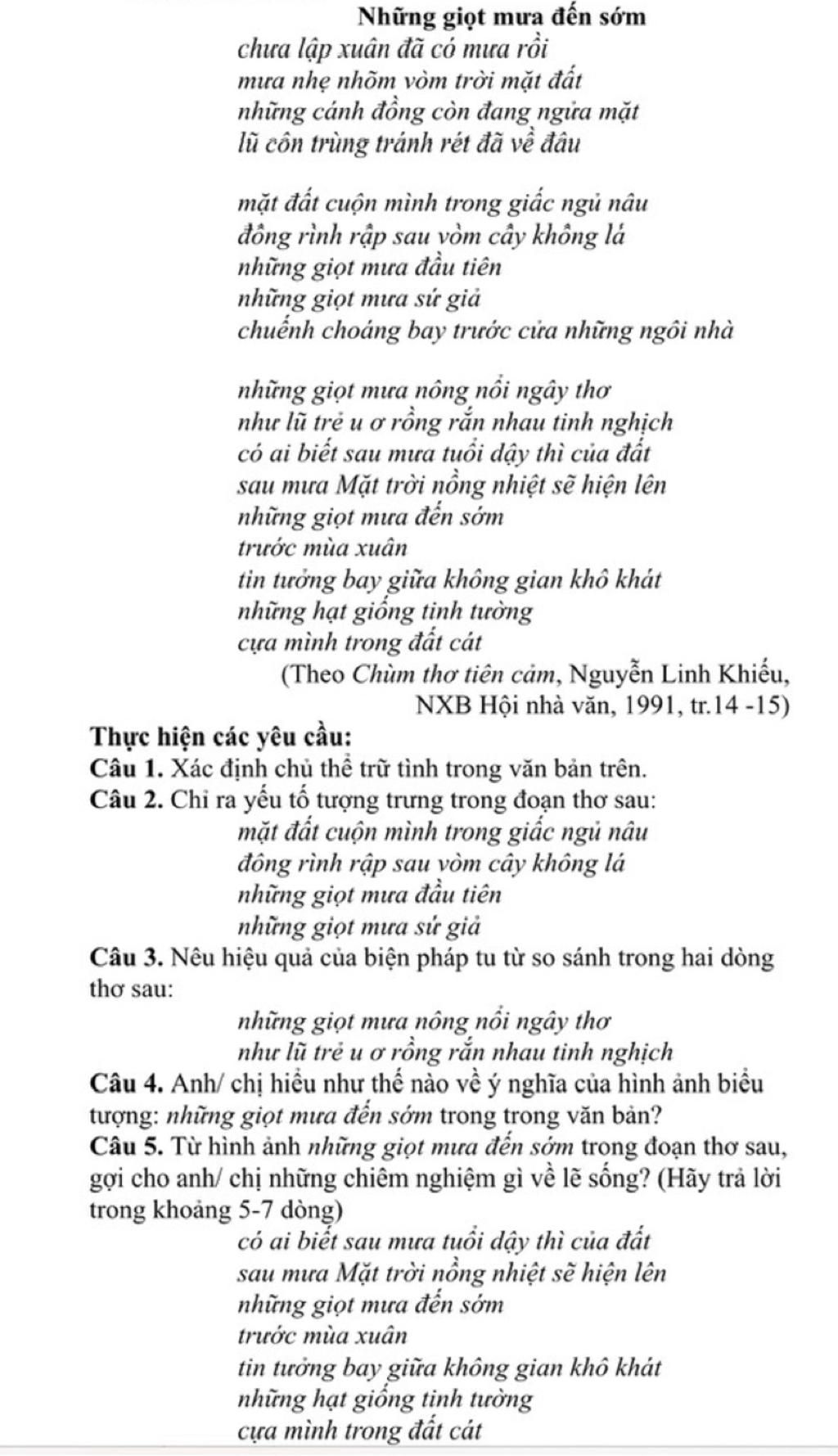 Câu 5: Hình ảnh "những giọt mưa đến sớm" gợi cho tôi suy nghĩ về sự thay đổi và hy vọng trong cuộc sống. Mưa đến sớm, trước mùa xuân, như một lời nhắc nhở rằng dù có bao nhiêu khó khăn hay thử thách, khi ta kiên trì và tin tưởng, một ngày nào đó sẽ có sự đột phá, sự đổi mới. Giống như hạt giống trong đất cát cựa mình chờ đón mùa xuân, mỗi người chúng ta đều có những lúc phải trải qua sự khô khát, gian khó, nhưng nếu kiên trì, sẽ đến lúc thành công và hạnh phúc sẽ nở rộ.