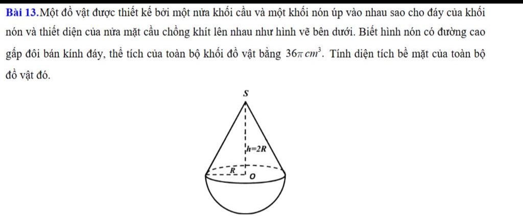 Do thể tích toàn bộ khối đồ vật là $36\pi cm^3$