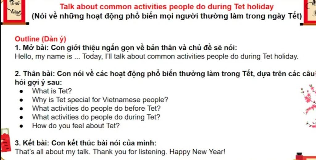 Xin chào, tên tôi là ........ Hôm nay, tôi sẽ nói về những hoạt động phổ biến mà mọi người làm trong dịp Tết.
