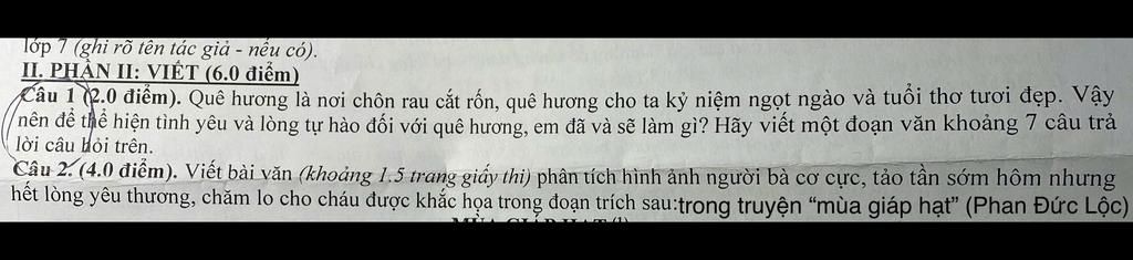 Câu 1 (2.0 điểm). Quê hương là nơi chôn rau cắt rốn, quê hương cho ta kỷ niệm ngọt ngào và tuổi thơ tươi đẹp. Vậy