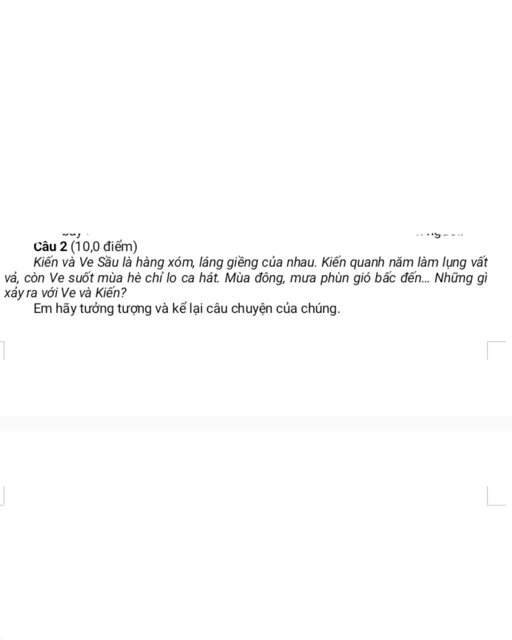 - Này Kiến, bây giờ là mùa hạ rồi, tất cả mọi người đều có kì nghỉ thoải mái làm sao! Vậy mà cậu vẫn khuân vác mấy cái món này về tổ làm gì cho cực thân? Cứ nghỉ ngơi đi cho sướng, hãy lên đây cùng tôi và ta cùng ca hát.