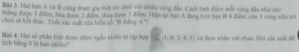 Bài 3. Hai bạn A và B cũng tham gia một trò chơi với nhiều vòng đấu. Cách tính điểm mỗi vòng đấu như sau: