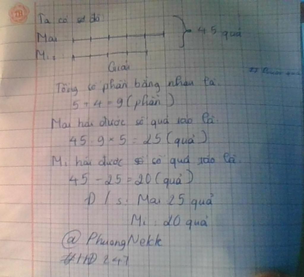 hai chị em Mai và Mi cùng nhau hái được 45 quả táo trong vườn. Số táo Mai hái được bằng 5/4 số táo Mi hai được. Hỏi hai chị em Mai và Mi, mỗi người hái được bao nhiêu quả táo?