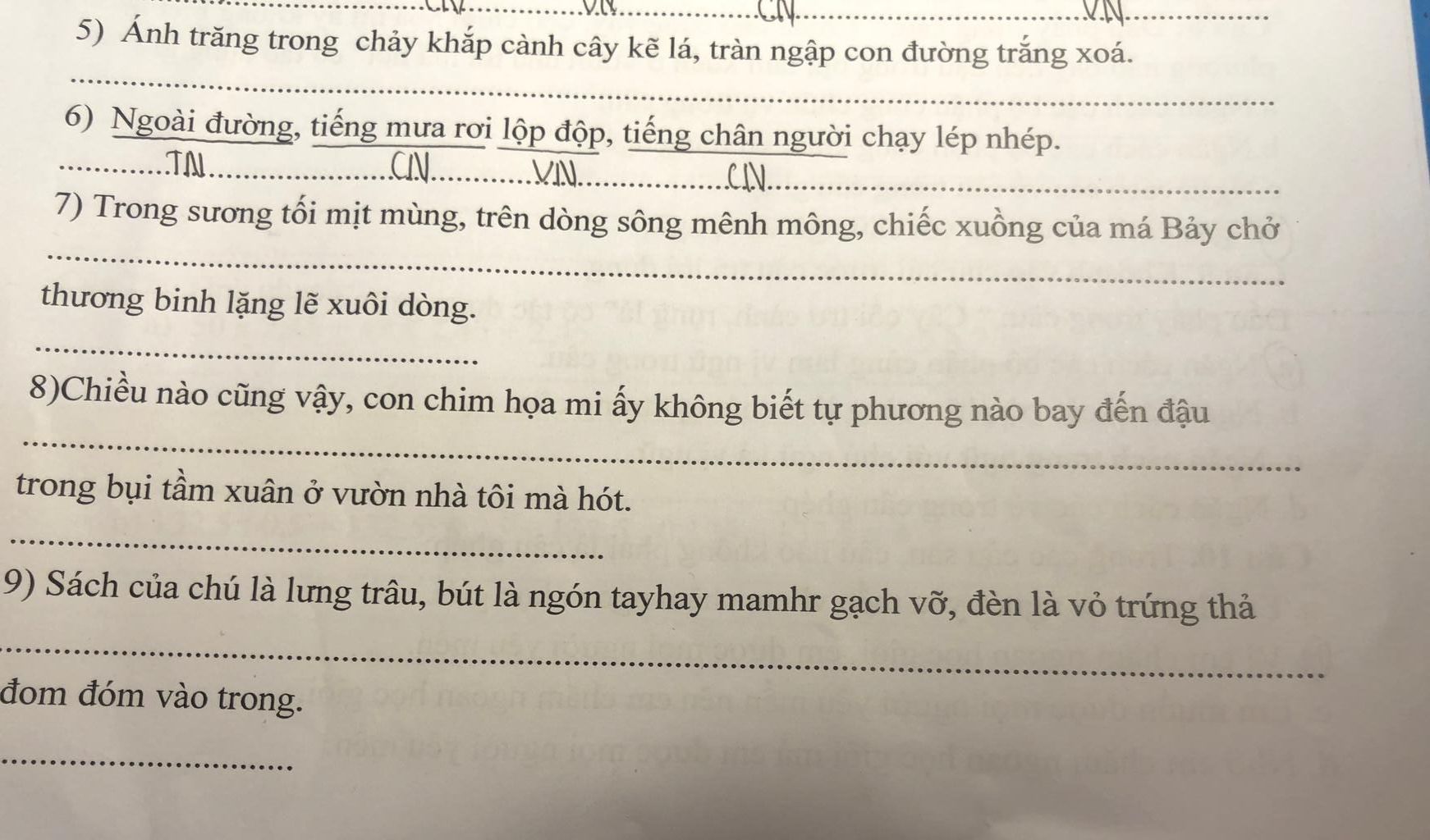 `8)` Chiều nào cũng vậy, con chim họa mi ấy không biết tự phương nào bay đến đậu trong bụi tầm xuân ở vườn nhà tôi mà hót.