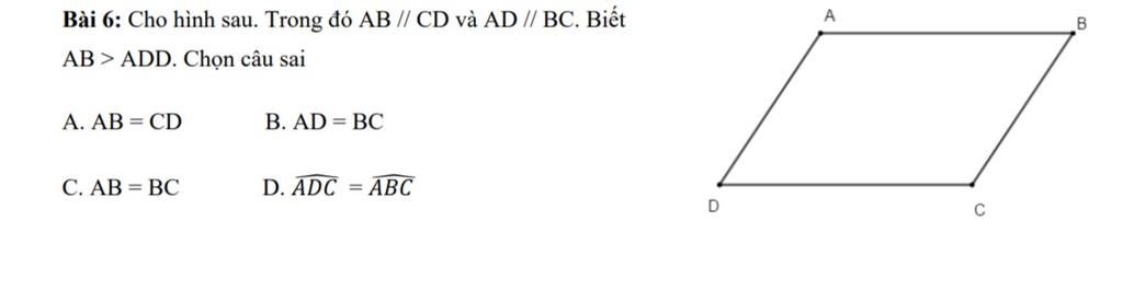 $⇒$ $AB = CD$; $AD=BC$; $∠ADC = ∠ABC$ ( tính chất hình bình hành )