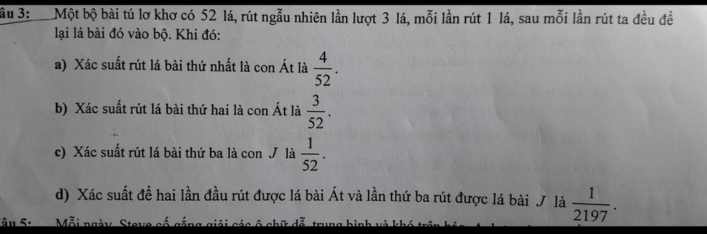 Một bộ bài tú lơ khơ có 52 lá, rút ngẫu nhiên lần lượt 3 lá, mỗi lần rút 1 lá, sau mỗi lần rút ta đều để