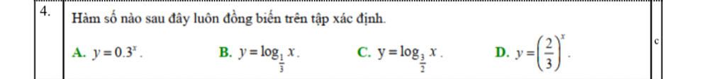 TQ: Hàm số `y=log_a x (0<a ne 1)` xác định trên `(0;+infty)`: