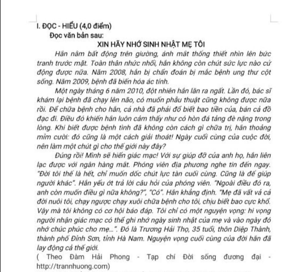 Trong văn bản, nhân vật “hắn” – Trương Hải Thọ – hiện lên như một biểu tượng của lòng nhân ái, sự hi sinh và tình yêu thương gia đình sâu sắc. Mặc căn bệnh ung thư cột sống ác tính, phải đối mặt với cái chết cận cảnh, nhưng thay vì thanh hùng số phận, tắm lại lựa chọn cách đối diện bằng sự bình yên và lòng bao dung. Thuốc không chỉ chấp nhận bệnh tật mà còn suy nghĩ về việc hiến giác mạc – một hành động động cao cả mong muốn giúp đỡ người khác, dù bản thân đang trong hoàn cảnh đau và tuyệt vọng. Điều đặc biệt ở Huy là tình cảm dành cho mẹ. Mẫu biết không thể báo đáp công lao sinh thành và dưỡng giáo, Tần đã gửi tinh nguyện vọng cuối cùng: người nhận giác mạc của ngọc hãy nhớ đến ngày nhật nhật của mẹ và gửi lời chúc phúc an lành đến bà. Đây không chỉ là một lời nhắn nhắn mà còn là minh chứng cho sâu thẳm sâu của chú chim. Nhân vật “hắn” đã viết lại một bài học lớn về ý nghĩa của sự hi sinh, lòng nhân ái và tình yêu thương gia đình, làm lay động trái tim bao người.