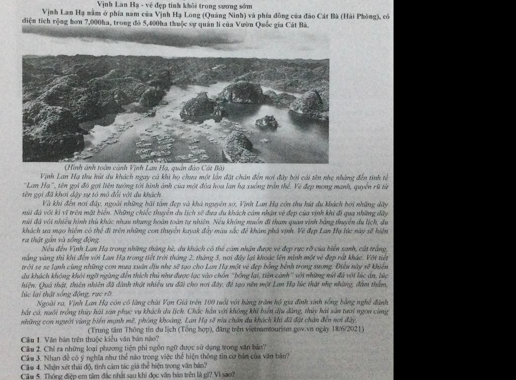 Thông điệp mà tôi tâm đắc nhất sau khi đọc văn bản là: “Thiên nhiên và văn hóa vùng đất luôn là những món quà vô giá, chúng ta cần khám phá, trân trọng và bảo vệ chúng.”Bởi đoạn văn gợi lên một tình yêu sâu sắc đối với vẻ đẹp kỳ diệu của Vịnh Lan Hạ, từ thiên nhiên hùng vĩ đến cuộc sống mộc mạc của làng chài Vạn Giá. Những hình ảnh như "vẻ đẹp bồng bềnh trong sương," "những dãy núi đá vôi kỳ vĩ," hay "làng chài trăm tuổi" không chỉ miêu tả một cách sống động mà còn nhấn mạnh giá trị cần được gìn giữ. Đọc văn bản, tôi cảm nhận rằng thiên nhiên không chỉ là nơi để tham quan, thưởng thức mà còn là di sản quý giá mà chúng ta phải bảo tồn.Với tốc độ đô thị hóa và những thách thức về môi trường ngày nay, việc nhận thức được tầm quan trọng của thiên nhiên và văn hóa trở nên cấp thiết hơn bao giờ hết. Thông điệp này không chỉ truyền cảm hứng để tôi khám phá các giá trị tuyệt vời của quê hương mà còn thôi thúc tôi hành động vì một tương lai bền vững, nơi vẻ đẹp của Vịnh Lan Hạ và nhiều vùng đất khác được bảo tồn cho thế hệ mai sau.