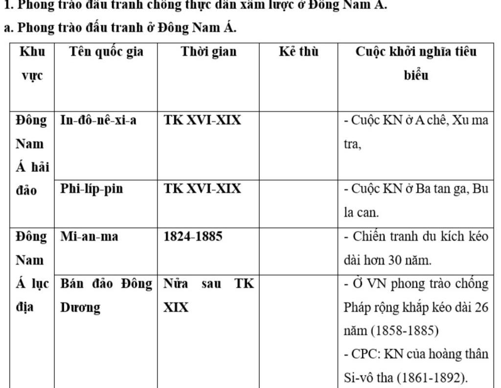 \begin{array}{|c|c|c|}\hline \text{Tên quốc gia}&\text{Kẻ thù}\\\hline \text{Indonexia }&\text{Hà Lan}\\\hline \text{Philipines}&\text{TBN và Mỹ - Hoa Kỳ}\\\hline \text{Myanmar}&\text{Anh}\\\hline \text{Đông Dương}&\text{Thực dân Pháp}\\\hline\end{array}