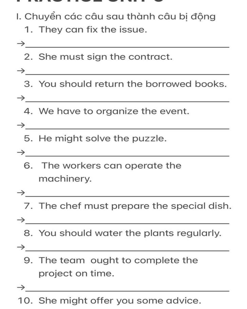 Vì đề bài yêu cầu chuyển các câu sau thành câu bị độngnên ta sẽ chuyển sang câu bị động.