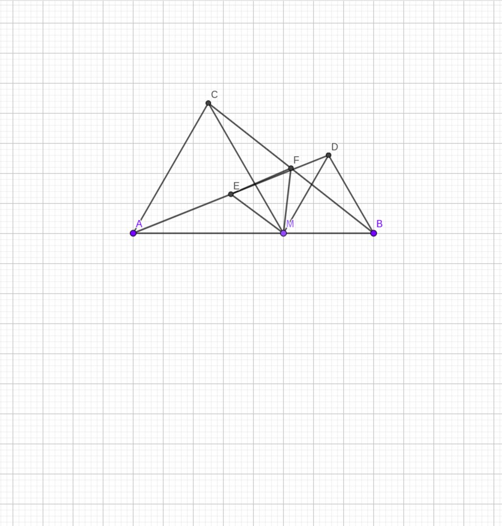Cho điểm M thuộc đoạn thẳng AB ( MA > MB ). Trên cùng một nửa mặt phẳng bờ là AB, vẽ các tam giác đều AMC,BMD. Gọi E,F lần lượt là trung điểm của AD,BC. Gọi K là giao điểm của AD và AC. CMR: