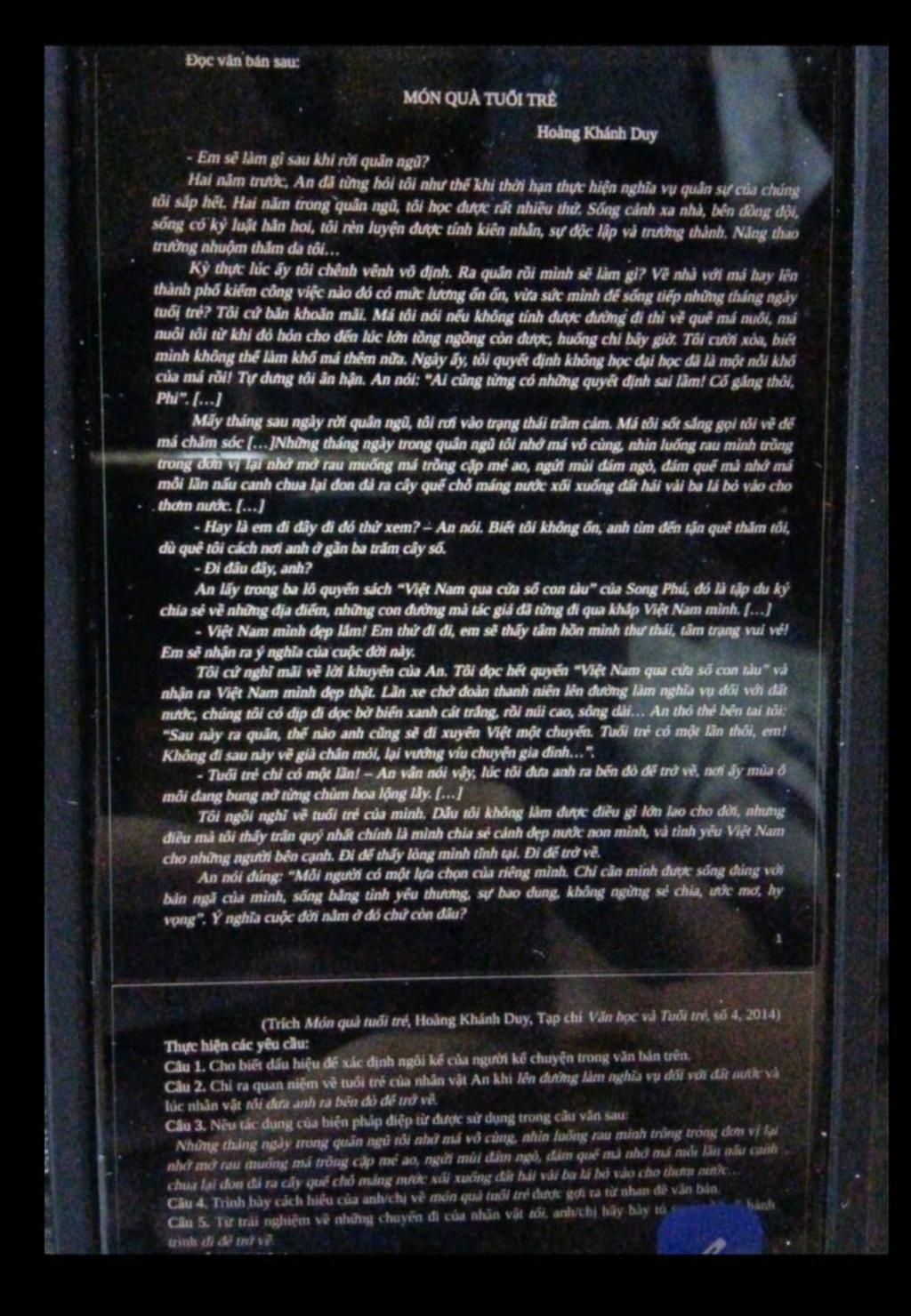 – An vẫn nói vậy, lúc tôi đưa anh ra bến đò để trở về, nơi ấy mùa môi đang bung nở từng chùm hoa lộng lẫy. [...] Tôi ngôi nghĩ về tuổi trẻ của mình. Dầu tôi không làm được điều gì lớn lao cho đời, nhưng điều mà tôi thấy trân quý nhất chính là mình chia sẻ cảnh đẹp nước non mình, và tình yêu Việt Nam cho những người bên cạnh. Đi để thấy lòng mình tỉnh tại. Đi để trở về. An nói đúng: "Mỗi người có một lựa chọn của riêng mình. Chỉ cần mình được sống đúng với bản ngã của mình, sống bằng tình yêu thương, sự bao dung, không ngừng sẻ chia, ước mơ, by vọng". Ý nghĩa cuộc đời năm ở đó chứ còn đâu? (Trích Món quà tuổi trẻ, Hoàng Khánh Duy, Tạp chí Văn học và Tuổi trẻ, số 4, 2014) Thực hiện các yêu cầu: Câu 1. Cho biết đâu hiệu để xác định ngôi kể của người kể chuyện trong văn bản trên Câu 2. Chỉ ra quan niệm về tuổi trẻ của nhân vật An khi lên đường làm nghĩa vụ đãi vài đặt sưth lúc nhân vật tôi đưa anh ra bên đò để mở về Những tháng ngày trong quân ngũ tôi nhờ mã vô cùng, nhìn luông rau mình trông trong đơn v Câu 3. Nêu tác dụng của biện pháp điệp từ được sử dụng trong câu văn sau nhớ mở rau muống mà nông cấp mé an, người mùi đâu ngô, đám quế mà nhờ mã mới làu nâu cá chua lại đơn đã ra cây quế chỏ màng nước xôi xuống đài hải vài ba là bỏ vào cho thay muc Câu 4. Trình bày cách hiệu của anh chị về món quà tuổi trẻ được gọi ra từ nhan đề văn bản. Câu 5. Từ trái nghiệm vẽ những chuyển đi của nhân vật tôi, anh thị hãy bày tỏ vinh đi để nở v