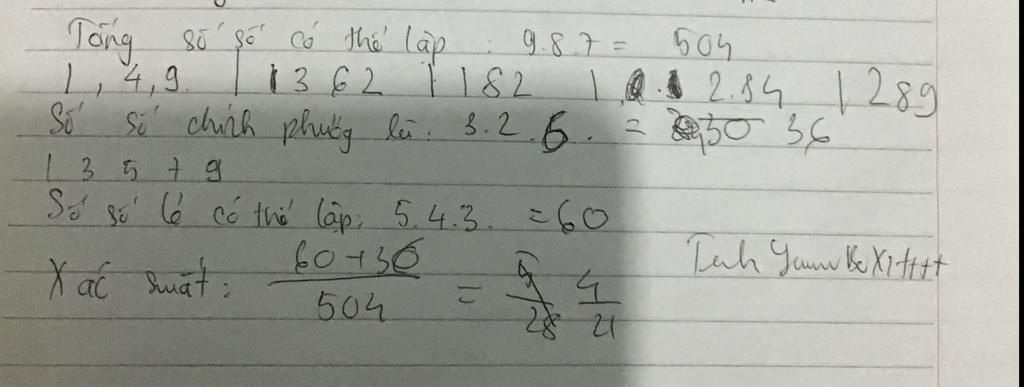 Gọi `X` là tập hợp các số tự nhiên có `3` chữ số đôi một khác nhau lập thành từ các số tự nhiên từ `1` đến `9`. Xác suất để số được chọn có tích các chữ số hoặc là số chính phương, hoặc là số lẻ?