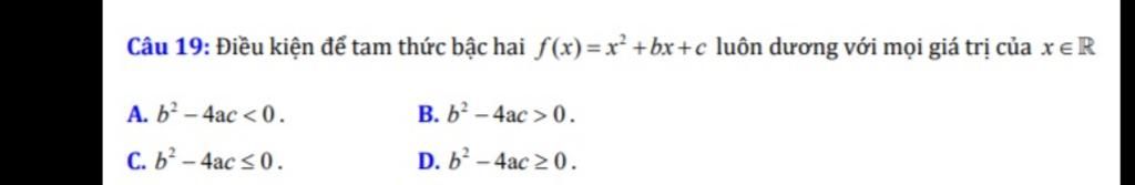 Tam thức bậc hai `f(x)=ax^2+bx+c` luôn dương khi: