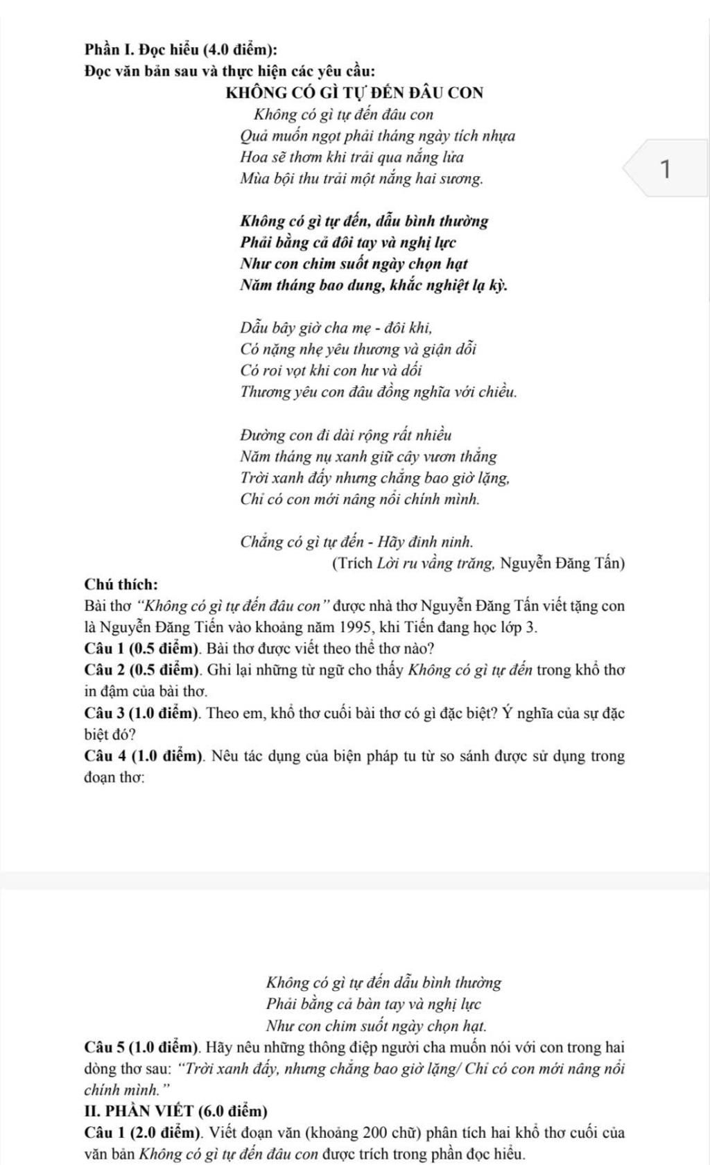 Bài thơ ''Không có gì tự đến đâu con'' của tác giả Nguyễn Đăng Tấn viết tặng con trai vào khoảng năm $1995$ đã để lại nhiều ấn tượng trong lòng người đọc, ẩn chứa những thông điệp sâu xa mang lại nhiều giá trị giáo dục tới con người. Ấn tượng nhất có lẽ chính là khổ thơ thứ $4$ và khổ thơ thứ $5$, chính là lời khẳng định về cuộc sống của cha dành cho con: