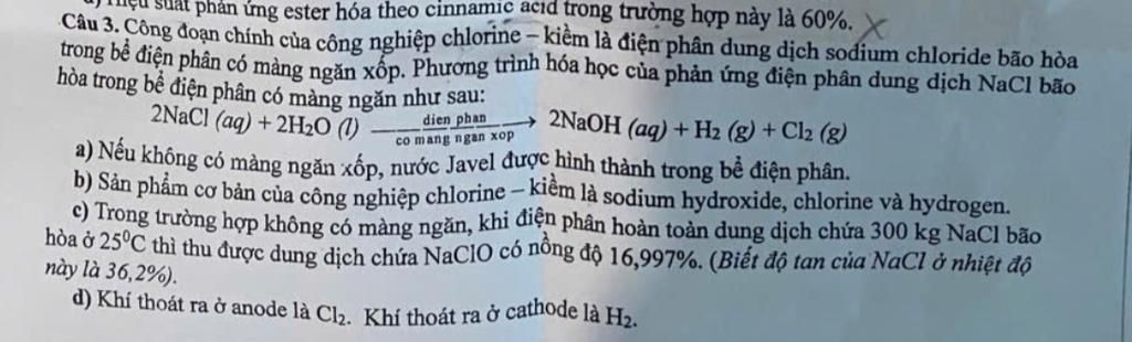Câu 3. Công đoạn chính của công nghiệp chlorine - kiềm là điện phân dung dịch sodium chloride bão hòa