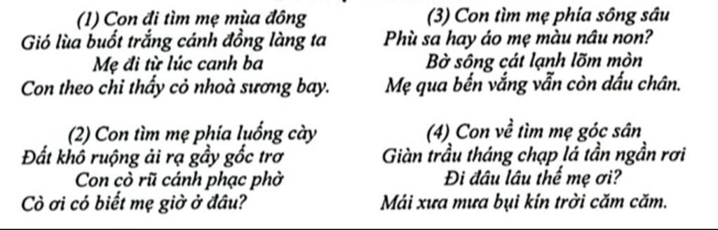 +) Những nỗi nhớ và mong muốn tìm tháy mẹ của người con: "Cò ơi có biết mẹ giờ ở đâu?" ; "Đi đâu lâu thế mẹ ơi?"
