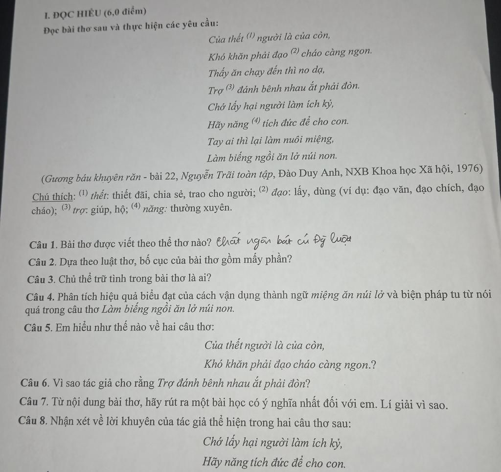 Câu 7. Bài học có ý nghĩa nhất đối với em từ bài thơ là: