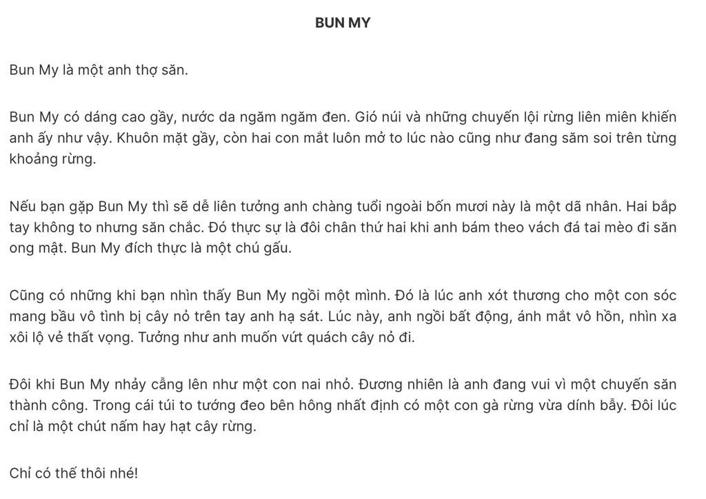 Viết đoạn văn (khoảng 200 chữ) phân tích đặc điểm của nhân vật Bun My trong truyện ngắn "Bun My" của tác giả Hữu Vi