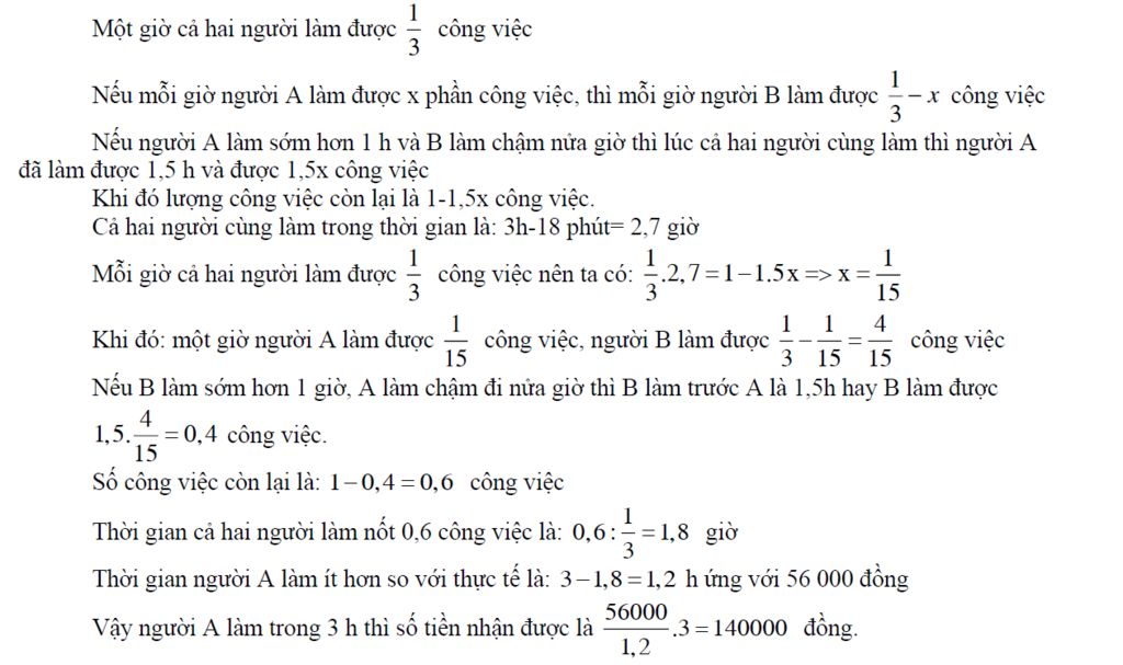 Hai người cùng làm xong một công việc sau 3 giờ, nếu người A làm sớm hơn 1 giờ và người B làm chậm hơn nửa giờ thì họ hoàn thành công việc đó sớm hơn 18 phút. Nếu người B làm sớm hơn 1h và người A làm chậm đi nửa giờ thì người A nhận tiền công ít hơn so với thực tế là 56 000 đồng, Hỏi thực tế người A nhận được bao nhiêu tiền công.