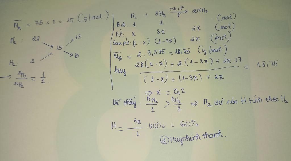 Một hỗn hợp khí A gồm N2 và H2 có tỉ khối đối với H2 bằng 7,5 . Tạo phản ứng giữa N2 và H2 cho ra NH3 bằng cách cho A đi qua chất xúc tác nung nóng thu được hỗn hợp khí B ( gồm 3 khí) có tỉ khối so với H2 bằng 9,375. Tính hiệu suất phản ứng.