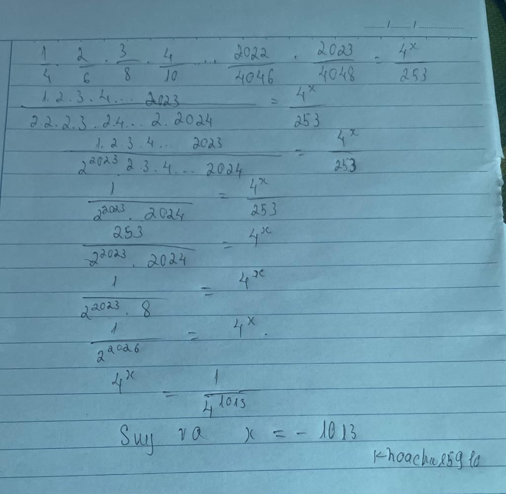 Ta có: `(1)/(4).(2)/(6).(3)/(8).. . ..(2022)/(4046).(2023)/(4048)=(4^x)/(253)`