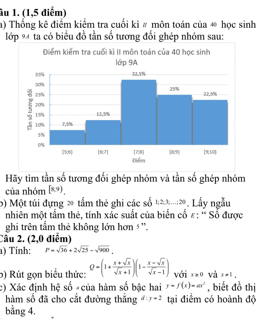 $a)$ Tần số tương đối ghép nhóm là `[8; 9)` là `25%`