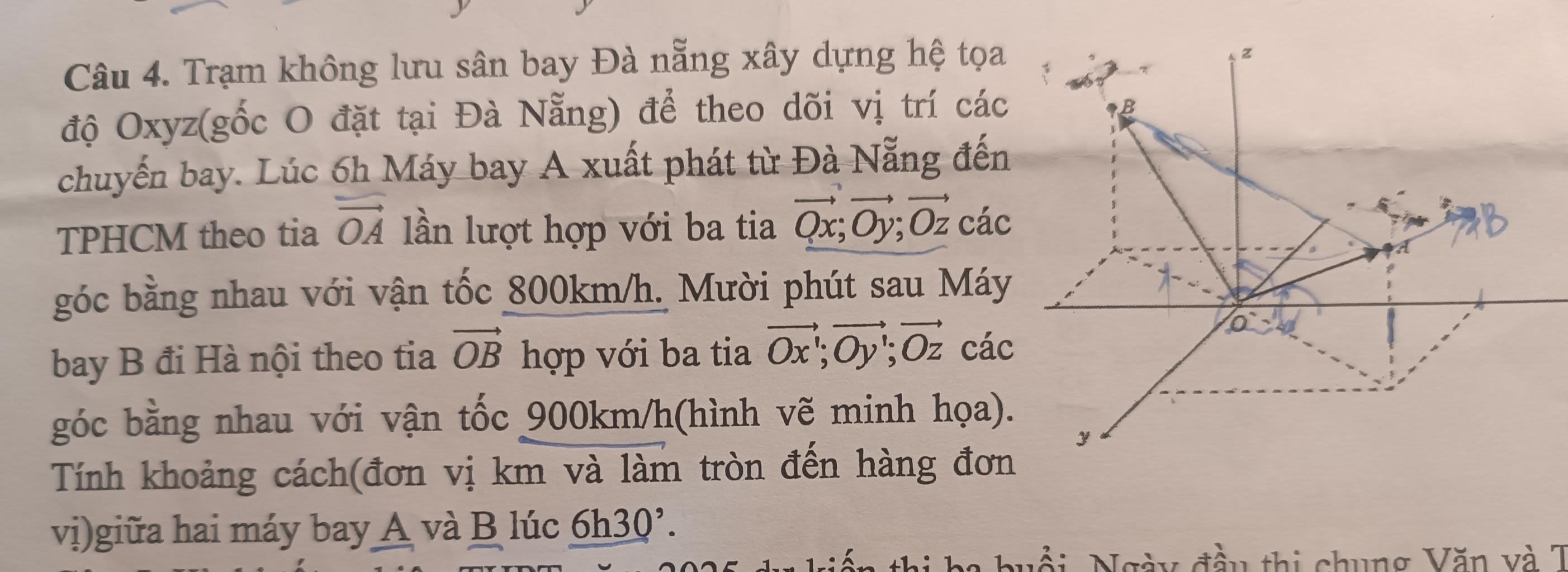 $\to AB=\sqrt{(\dfrac{400}{\sqrt3}+100\sqrt3)^2+(\dfrac{400}{\sqrt3}+100\sqrt3)^2+(\dfrac{400}{\sqrt3}-100\sqrt3)^2}\approx 574(km)$