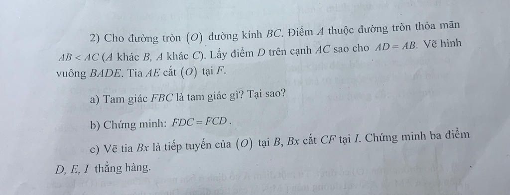 $a)$ $\triangle$ $FBC$ là tam giác vuông cân. Thật vậy: