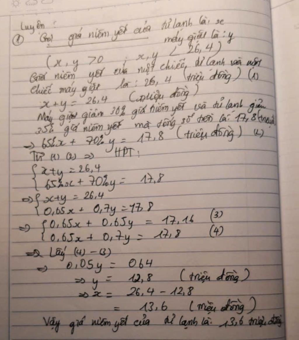 Giá máy giặt sau khi giảm là: `y - 30%y = 0,7y` `(`triệu đồng`)`