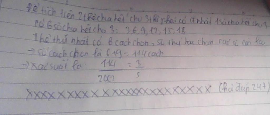 Một hộp có 20 tấm thẻ cùng loại đánh số từ 1 đến 20 tính xác suất của tích các số ghi trên 2 thẻ lấy ra là số chia hết cho 3