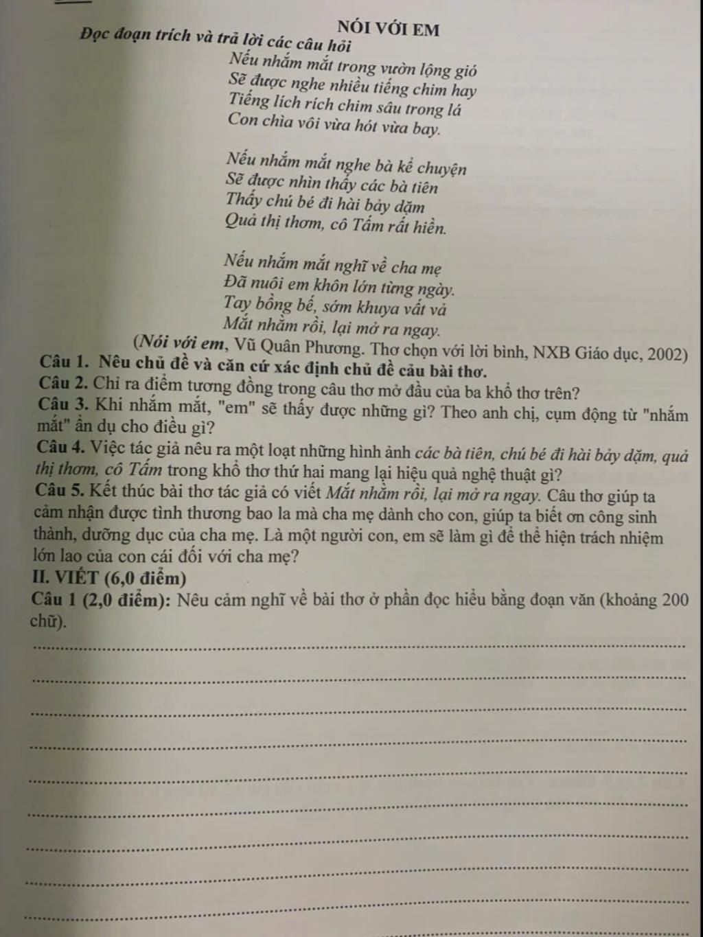 Câu 5: Kết thúc bài thơ tác giả có viết Mắt nhắm rồi, lại mở ra ngay. Câu thơ giúp ta cảm nhận được tình thương bao la mà cha mẹ dành cho con, giúp ta biết ơn công sinh thành, dưỡng dục của cha mẹ. Là một người con, em sẽ làm gì để thể hiện trách nhiệm lớn lao của con cái đối với cha mẹ?